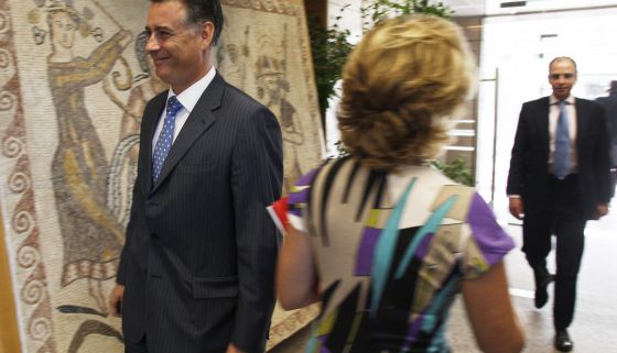 | Alberto López Viejo, exconsejero de Deportes de la Comunidad de Madrid, se cruza con Esperanza Aguirre en la Asamblea de Madrid. / LUIS SEVILLANO |
